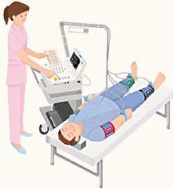 この検査では、あお向けに寝た状態で両腕・両足首の血圧と脈波を測定します。時間は5分程