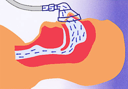 機械の中のモーターが、ちょうどドライヤーのように、空気のフロー(流れ)をつくることで気道の内圧を上げ上気道の閉塞を防ぎます。