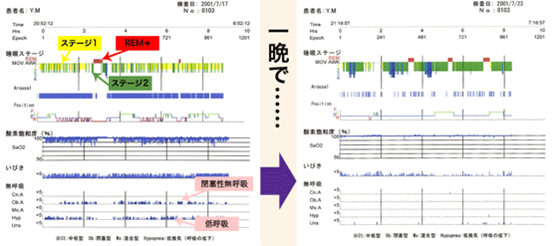 ・生活習慣改善、マウスピース、CPAP、手術等の治療で睡眠中の上気道の狭窄を改善してから、精密PSGで調べると呼吸も安定し、睡眠の分断が改善されることが分かります。