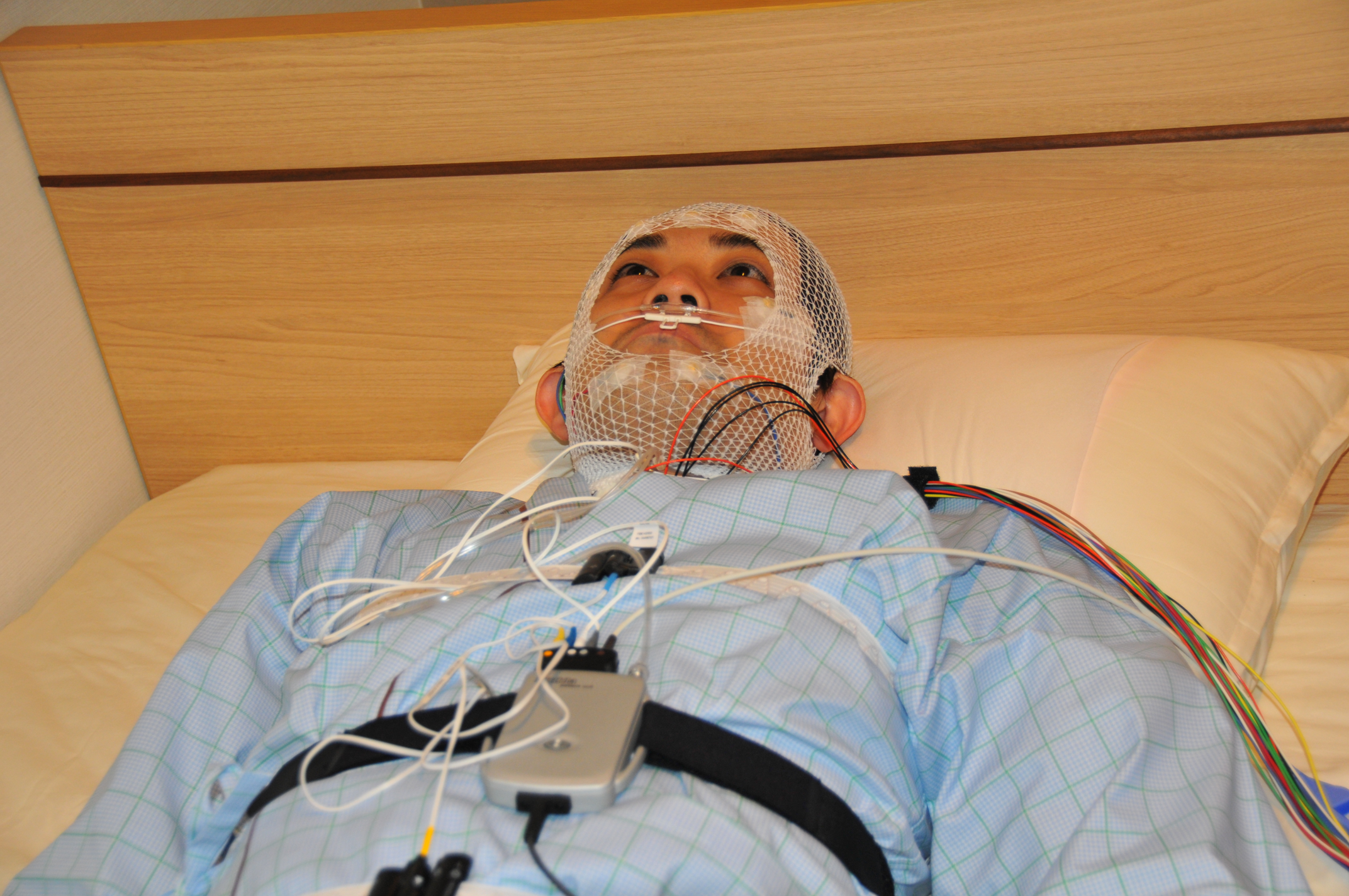 ・睡眠中の脳波、呼吸状態、SpO2、胸部腹部の呼吸運動、睡眠中の体位、心電図、眼球運動を調べる検査です。