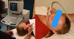 ベッドに仰向けになり、首にゼリーをつけて頸動脈のエコーをとります。